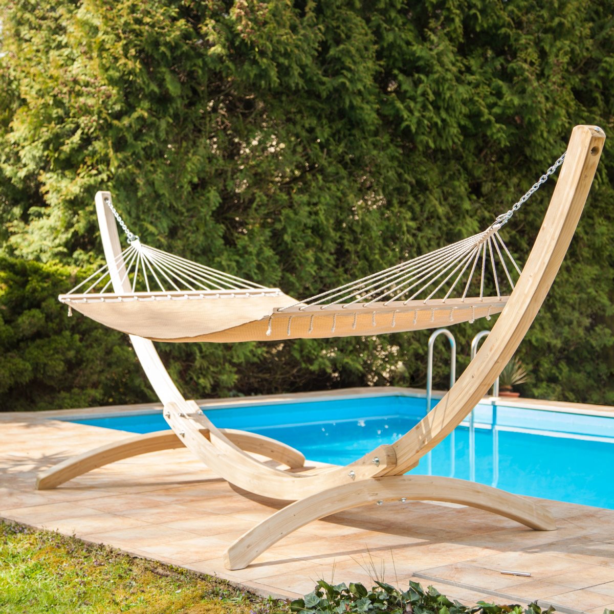 Grand nombre de fils de suspension Le grand nombre de cordes de suspension reliant le tissu du hamac à la boucle d'accrochage permet une répartition idéale du poids sur toute la largeur de la toile. C'est la garantie de la grande longévité d'un hamac et de son confort inégalable. |